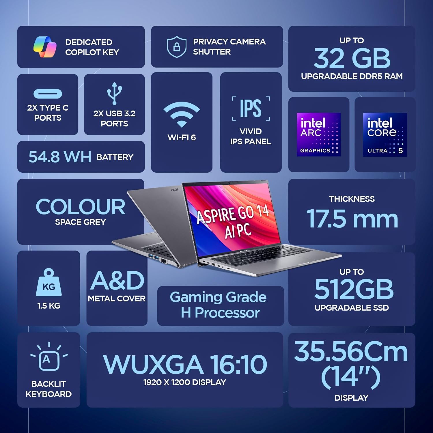Acer Aspire Go 14 AI Laptop is powered by the latest Intel Core Ultra 5 125H processor, delivering fast and efficient performance for work, study, and entertainment. It features 16GB DDR5 RAM and 512GB SSD for smooth multitasking and quick storage. The 14-inch WUXGA IPS display, Windows 11 with MS Office, and backlit keyboard make it a perfect lightweight laptop for everyday productivity.